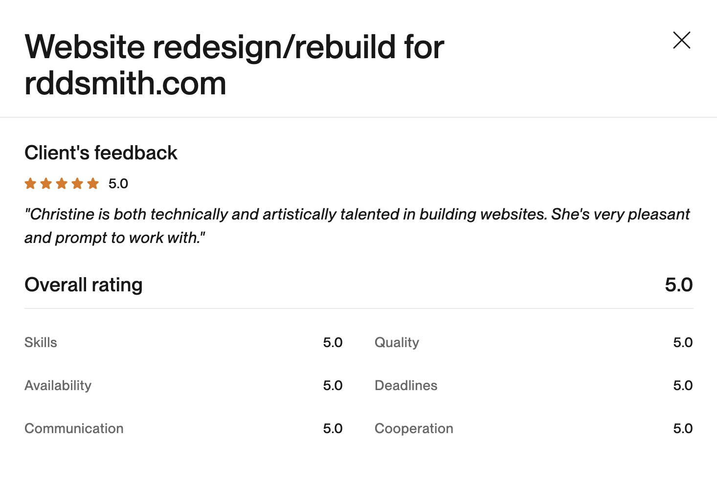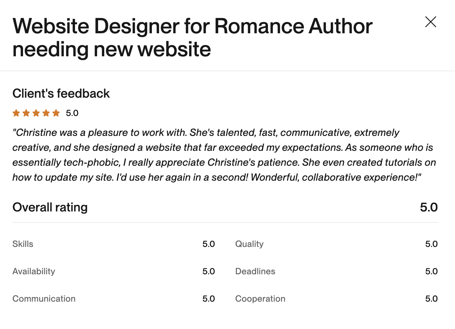 That’s right, 100% job success across almost 200 projects spanning almost a decade. Over 80% of my projects are long term, with clients who love working with me. That’s not even counting private clients who have found me via referrals.